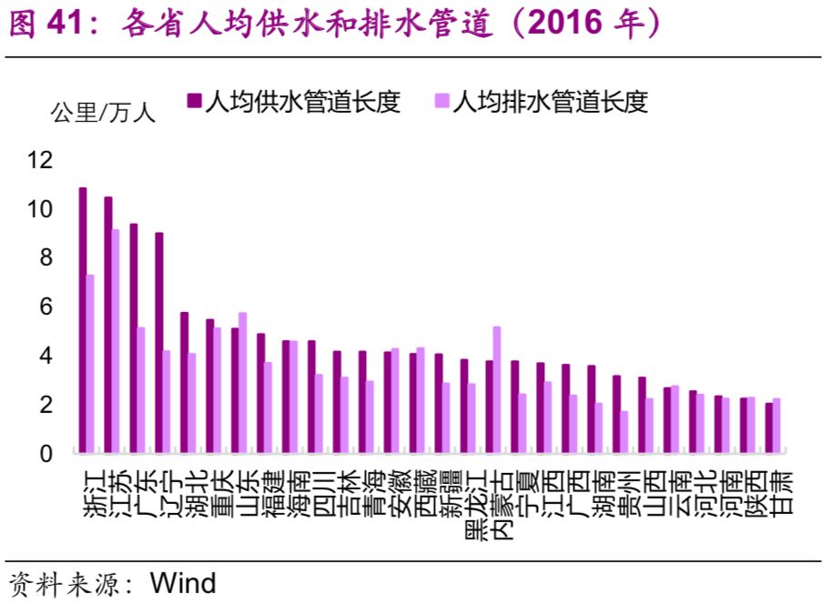人均供水管道排名前三的省份是浙江(10.8公里/万人)、江苏(10.4公里/万人)、广东(9.3公里/万人);排名倒数前三的是甘肃(2.0公里/万人)、陕西(2.2公里/万人)、河南(2.3公里/万人)(图41)。排水管道的情况与供水管道类似。